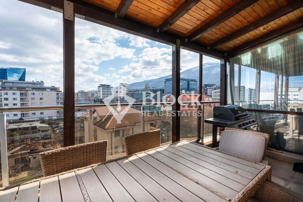 Жилището се намира на пети етаж. Площта му е 142 кв. м., разпределени по следния начин : входно антре, три спални, едната от които със самостоятелен балкон, просторен хол с кухненски бокс и трапезария с излаз към тераса с панорамна гледка към Витоша, два санитарни възела и килер.